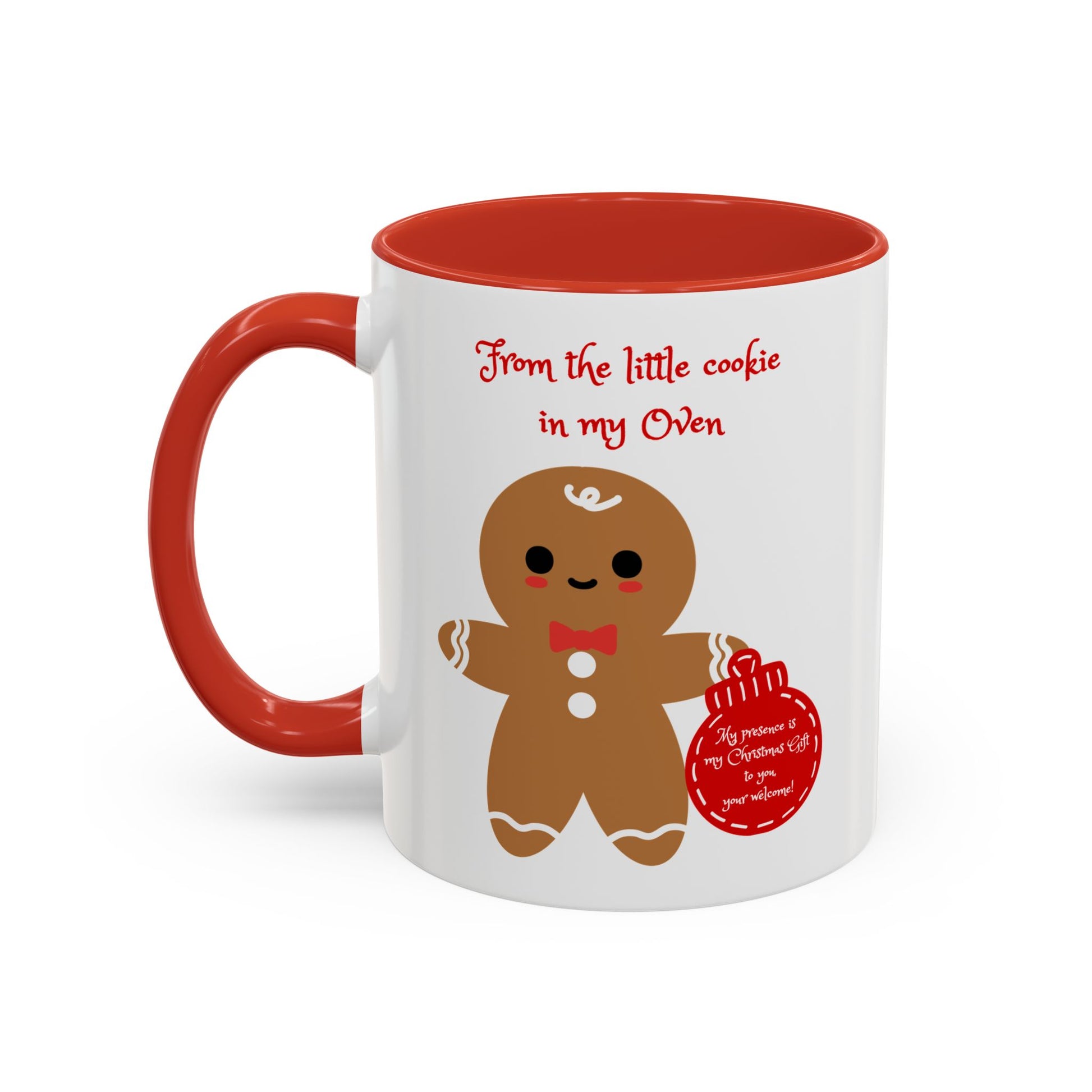 A perfect gift for expecting mothers with their own little cookie in the oven. Warm and whimsical, this ceramic accent mug brings a touch of holiday baking straight to your morning routine. A smiling gingerbread character stands beside a bright red ornament, under the playful line “From the little cookie in my oven.” The colored handle and interior add a pop that makes every coffee break feel festive. It’s sturdy, glossy, and made to brighten chilly mornings or cozy evenings with cocoa and conversation.
