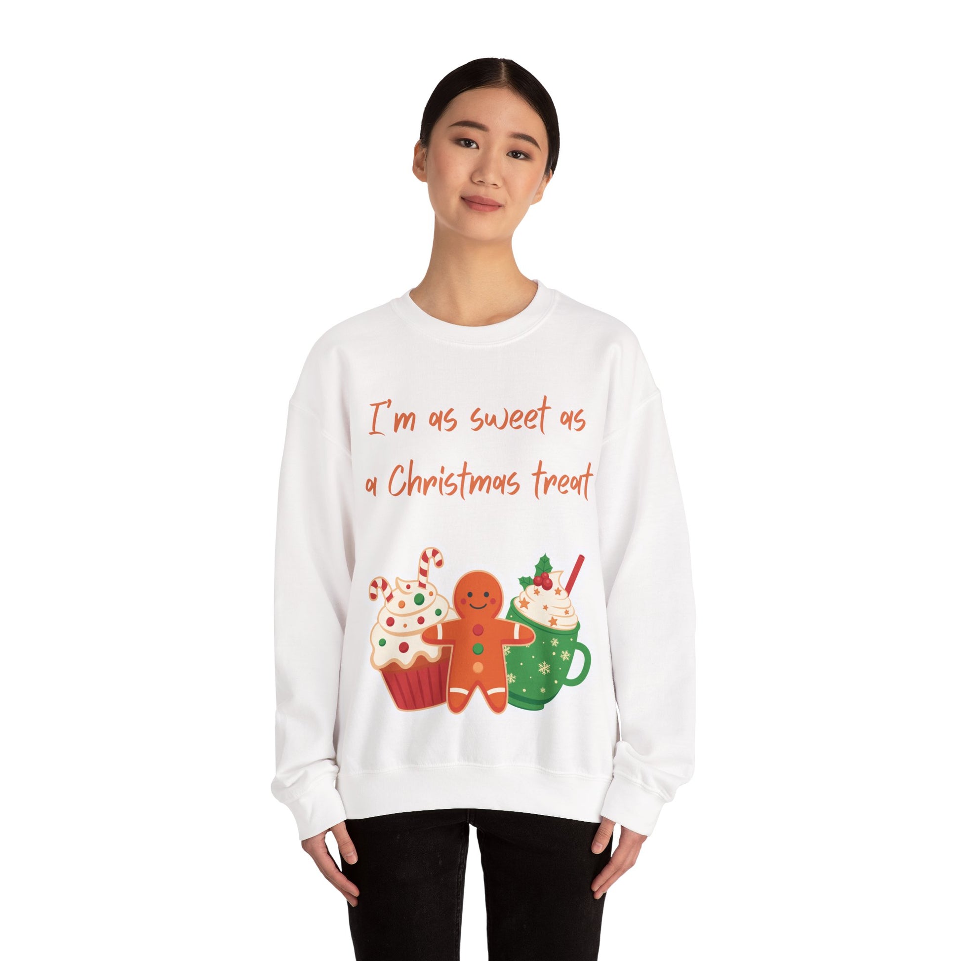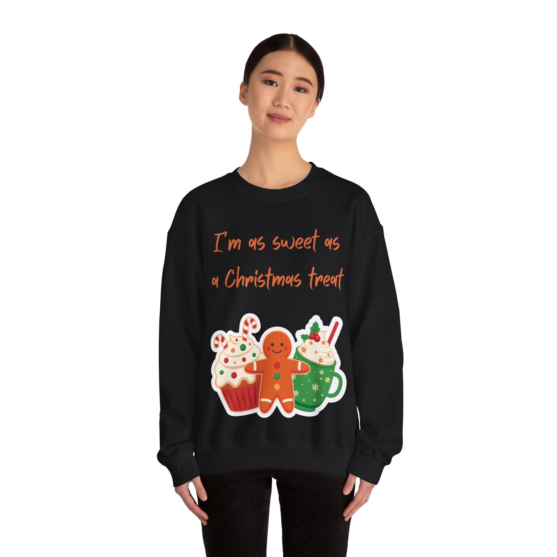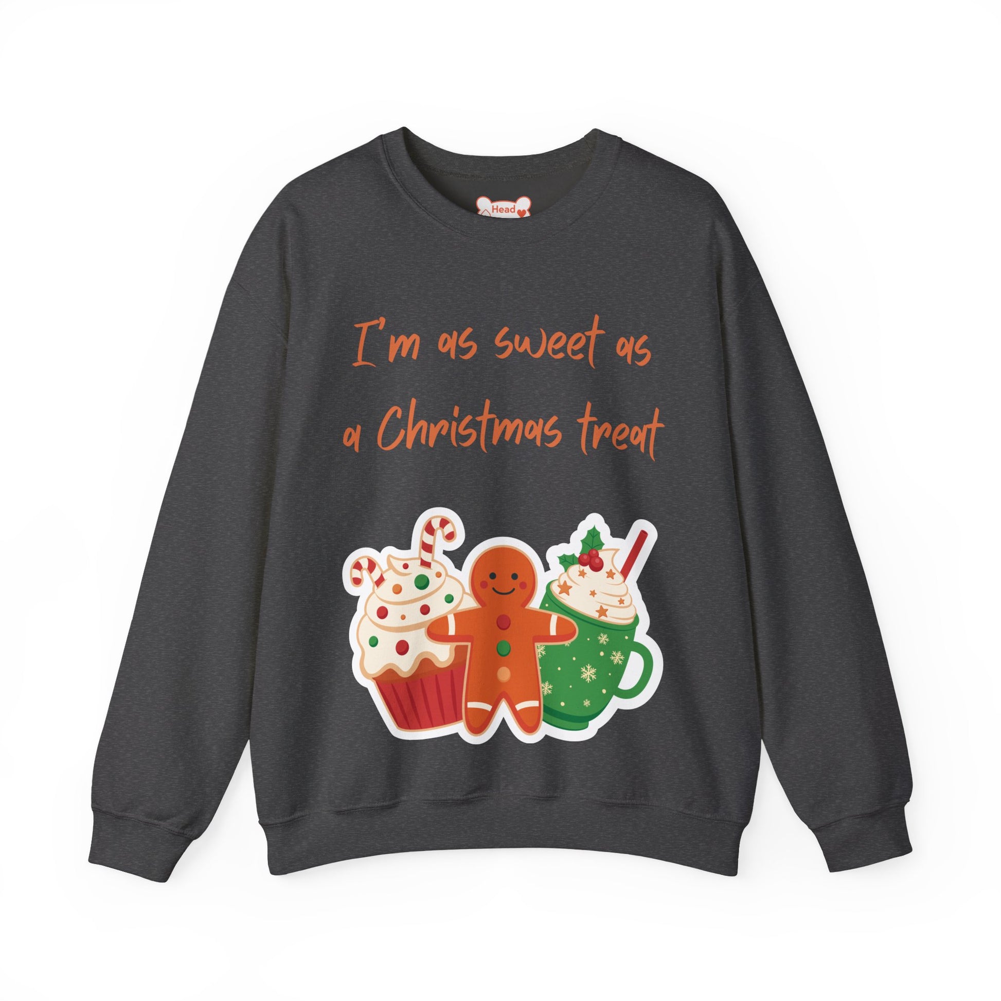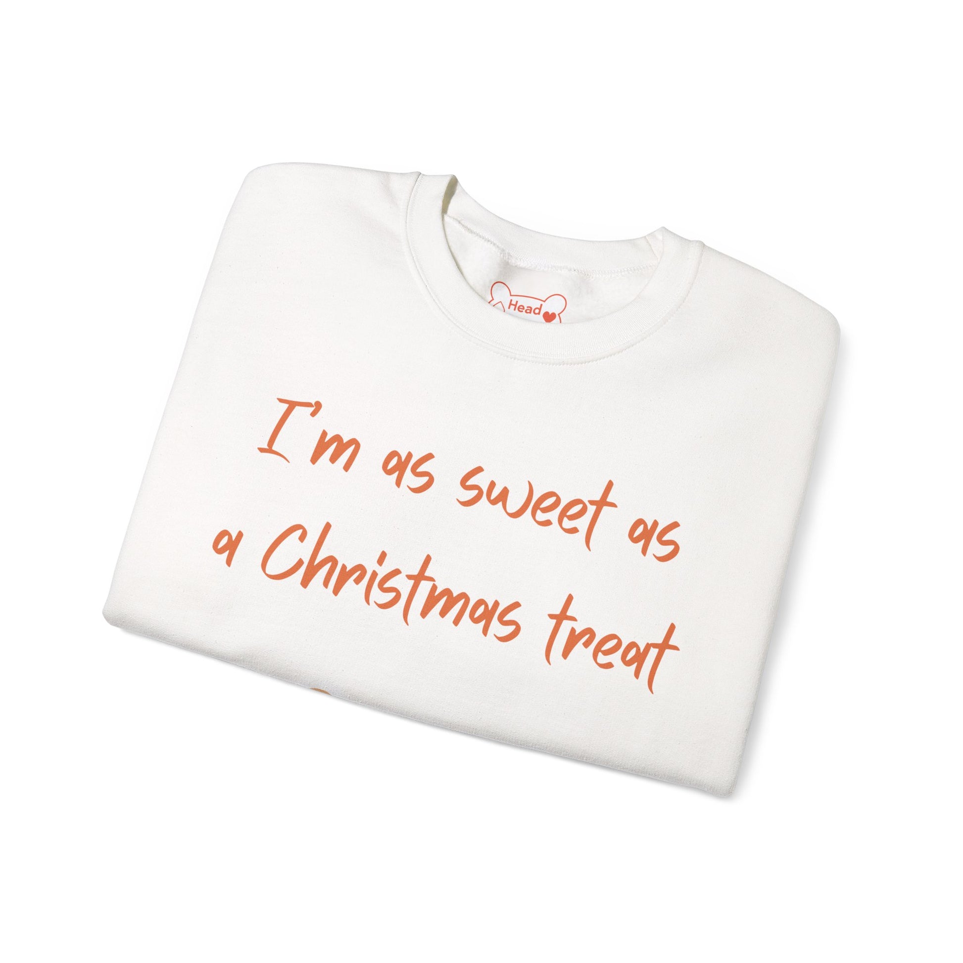 This cozy crewneck brings warm holiday cheer with a playful baked-goods design and soft, lived-in comfort. A smiling gingerbread, frosted cupcakes, and a steaming festive mug sit beneath the hand-lettered phrase “I’m as sweet as a Christmas treat,” creating a lighthearted, nostalgic look that feels like a kitchen full of fresh-baked memories. The midweight cotton-poly blend holds its shape while staying soft against skin, and clean double-needle seams mean this sweatshirt will travel from morning cocoa to evening movie nights without losing its cozy feel.
