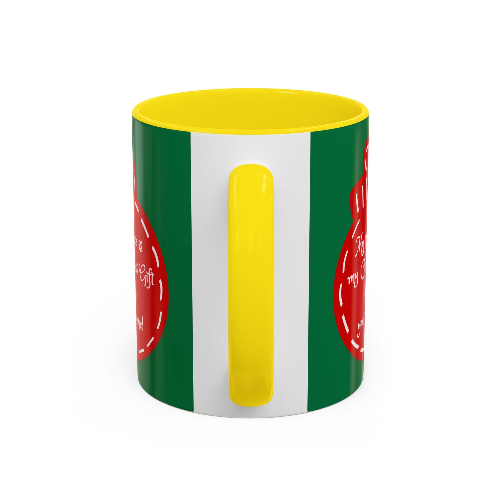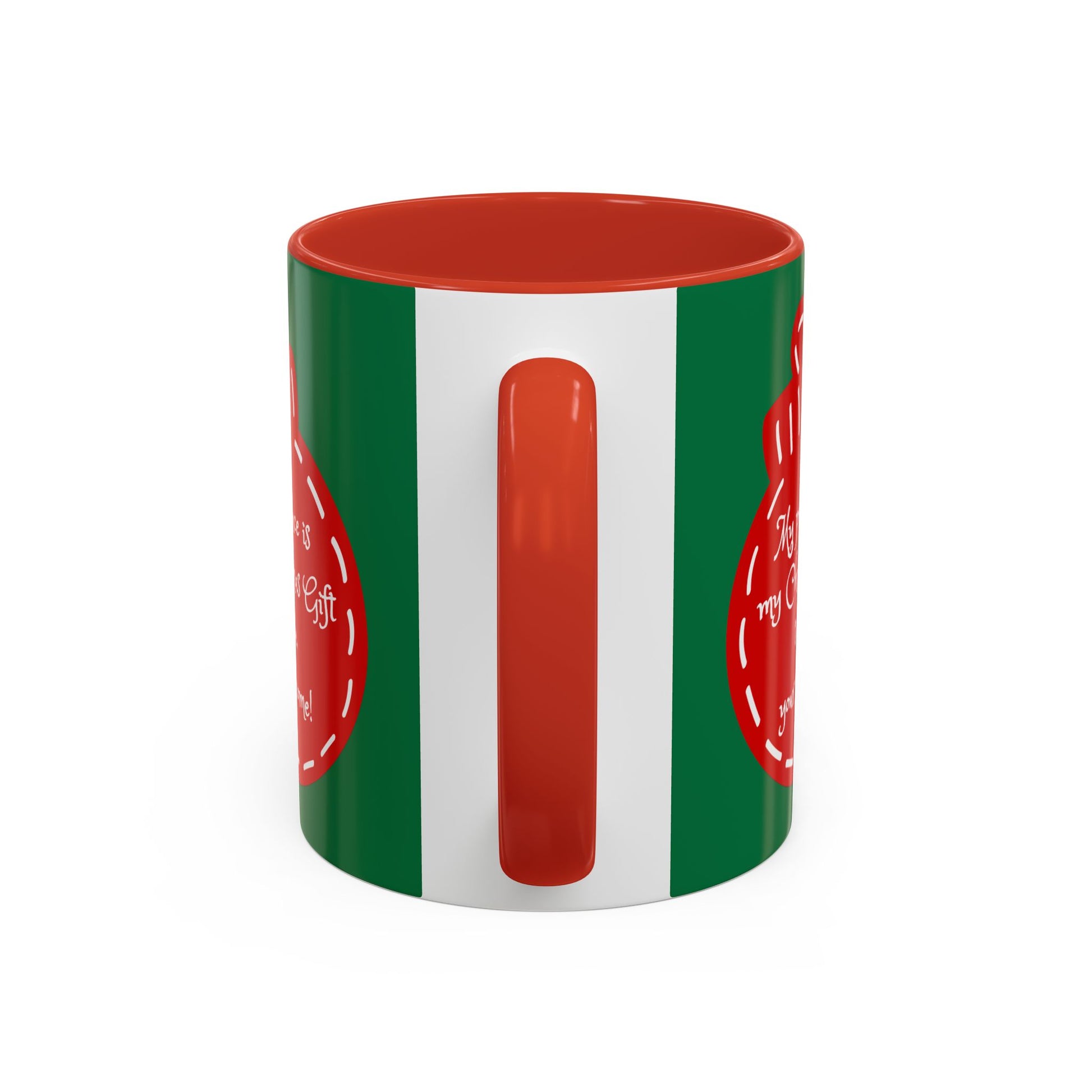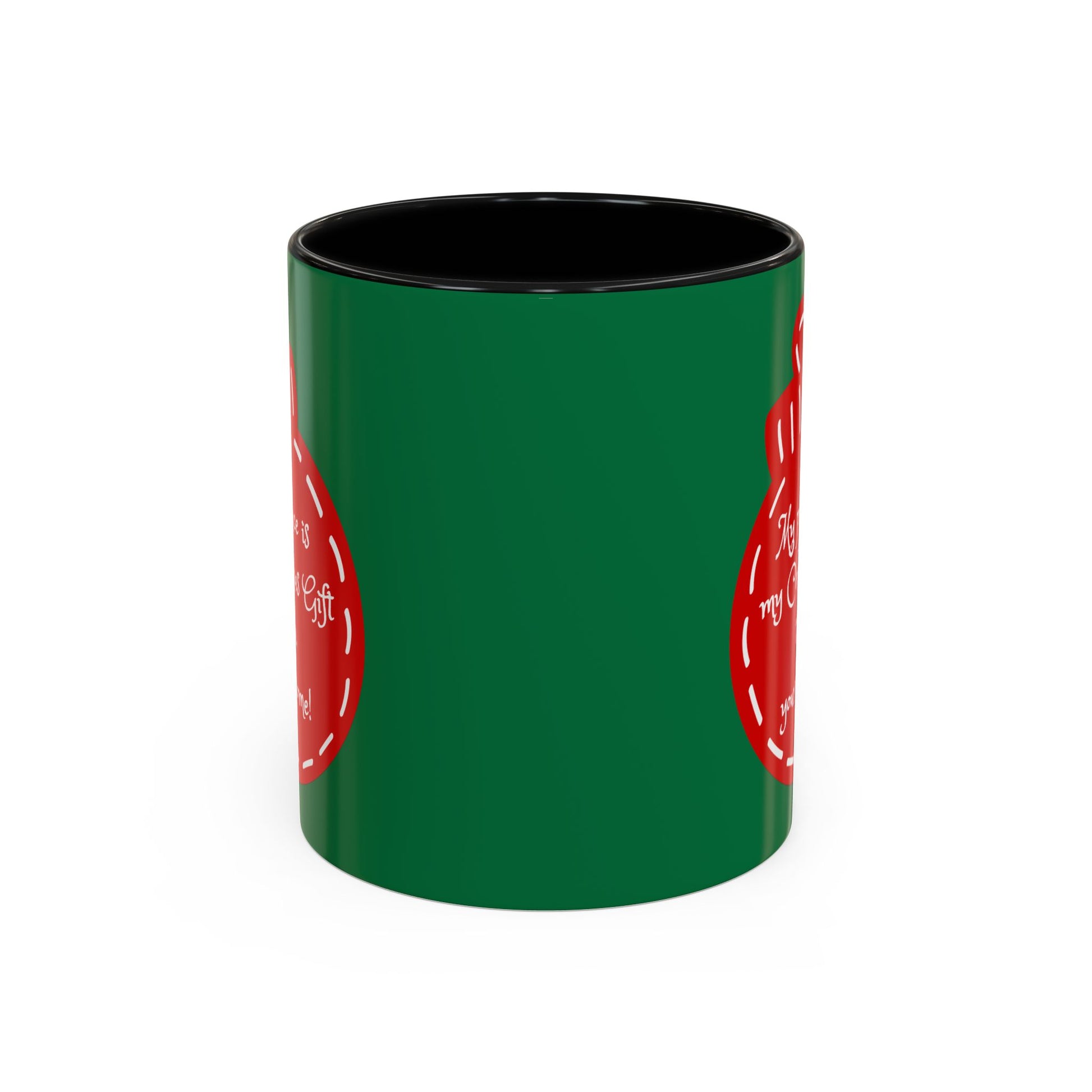 This glossy ceramic mug carries a warm, playful holiday vibe — deep green exterior, bold black interior and handle, and a stitched-red ornament graphic that reads, “My presence is my Christmas gift to you, you’re welcome!” Hold it and feel the wink: a little bit cheeky, a lot cozy. It’s the kind of cup you reach for on slow mornings by twinkling lights, or set by the tree while wrapping gifts and sipping something spiced. Fits naturally into casual family mornings, holiday brunches, or quiet evenings with a book and soft music. The contrast colors make the design pop while the comfortable C-handle and smooth glossy finish keep it familiar and easy to use.